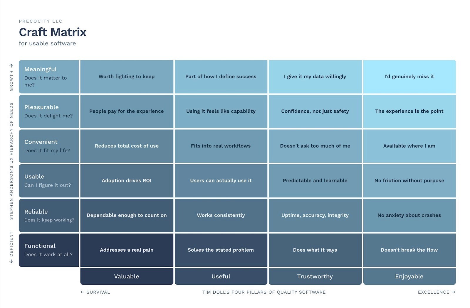 Brandon Ward is Chief Experience Officer at Precocity, a UX Design, UX Research, and Service Design practice working with enterprise organizations. The four pillars referenced in this article were developed by Tim Doll, CEO and President of Precocity. The Craft Matrix is a Precocity synthesis of Doll's pillar model and Stephen Anderson's UX Hierarchy of Needs.